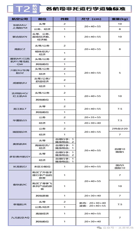 太原機場執飛航空公司的隨身手提行李標準