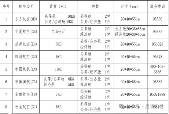 呂梁機場執飛航空公司的隨身手提行李標準
