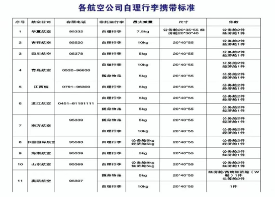 臨汾機場執飛航空公司的隨身手提行李標準